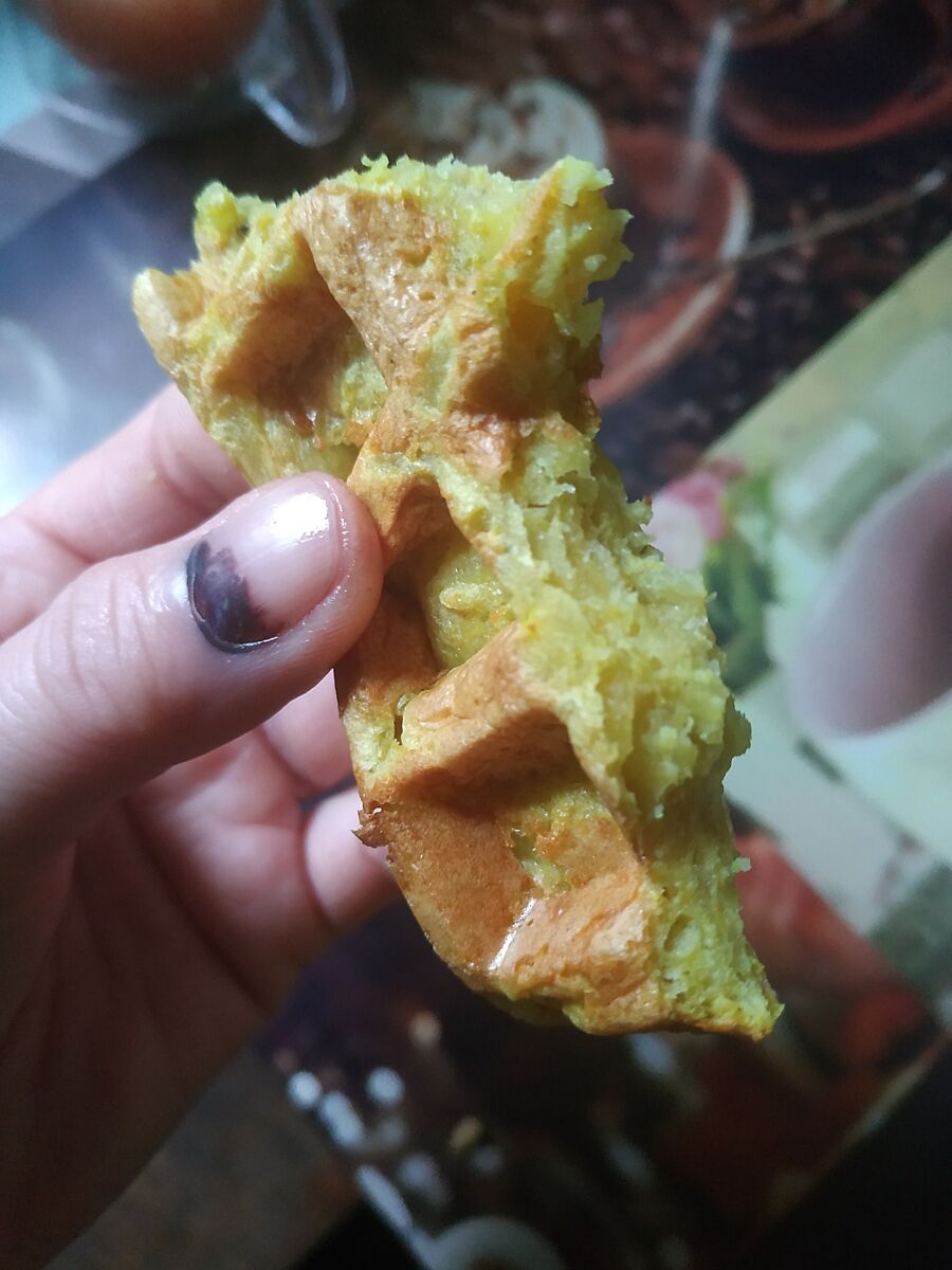 Смесь накладывается столовой ложкой в вафельницу. Выпекание-10-12 мин. Можно было добавить порубленный лук,но я спешила.