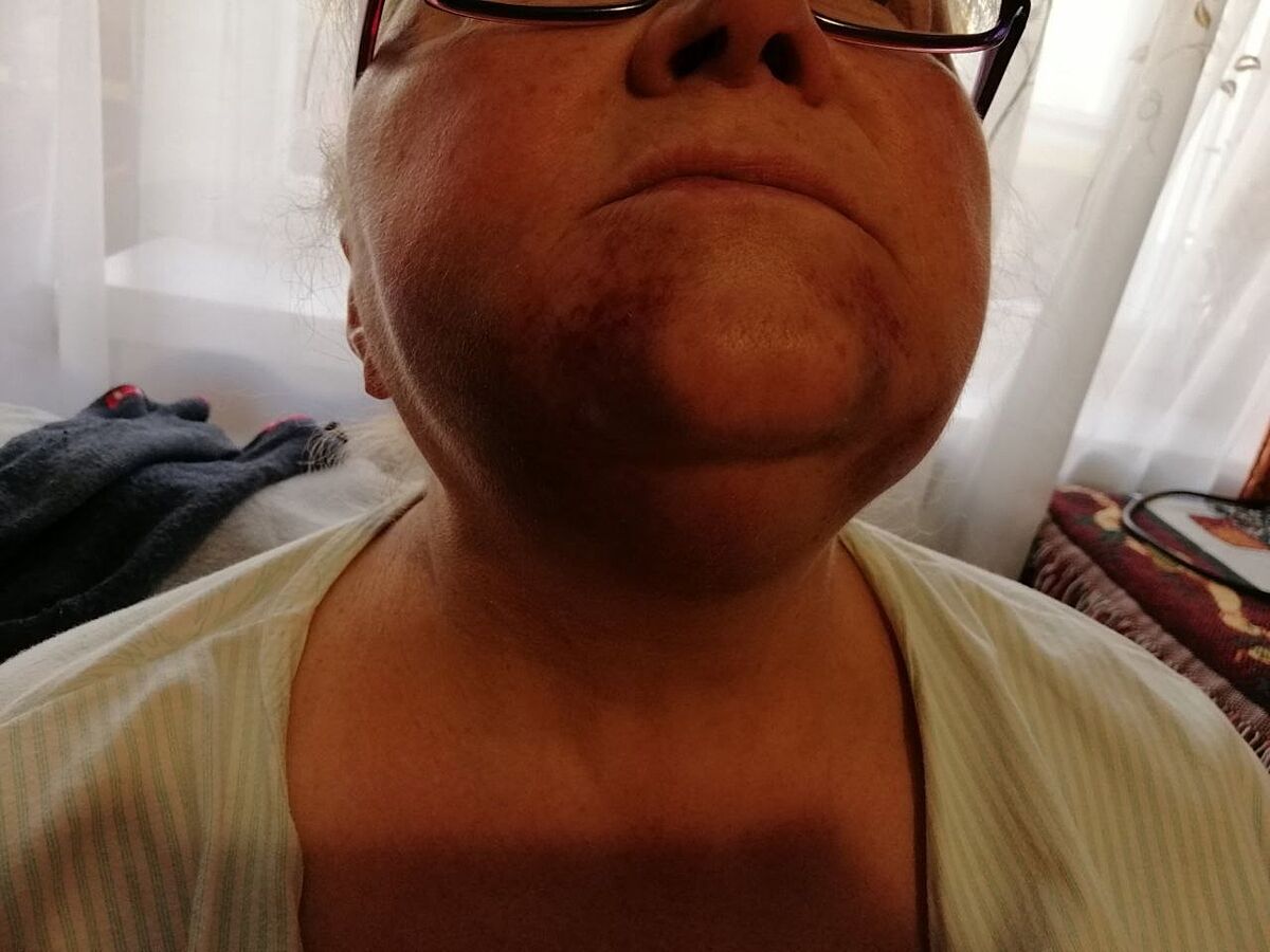у мене подібний синець, як у жінки на фото - був з місяць після операції з випилювання вісімки з кістки, але з одного боку...