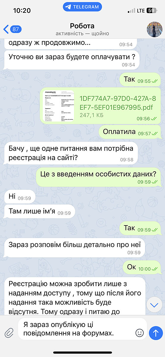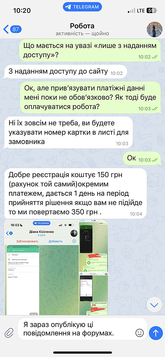 На сайті Олх оголошення про віддалену роботу. Написала, щоб надали детальну інф. Типу сайт по перекладу та редагуванню текстів. Для реєстрації типу потрібно 200 грн. Ок, оплатила. Потім для надання доступу сказала, що ще треба 150 оплатити)))) я сказала щоб повертала кошти. Скинула мені якесь не зрозуміле посилання на сайт, хоча заявляла що роботу надають самі, а там потрібно американським продавцям пропонувати перекласти їх обʼяви на фашиську мову😂😂😂 потім скинула сайт з неактуальними повідомленнями про роботу за 2016, 2017 рік))) взагалі не ведуся на такі лохотрони, а тут наче біс попутав. Коротше будьте обережніші, скріни додаю
