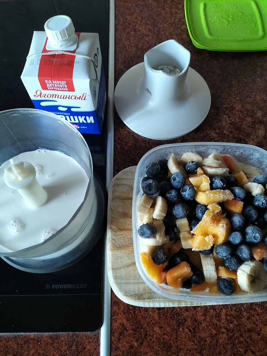 Додати порізані, заморожені фрукти та ягоди і збивати до однорідної консистенції періодично перемішуючи ложкою.