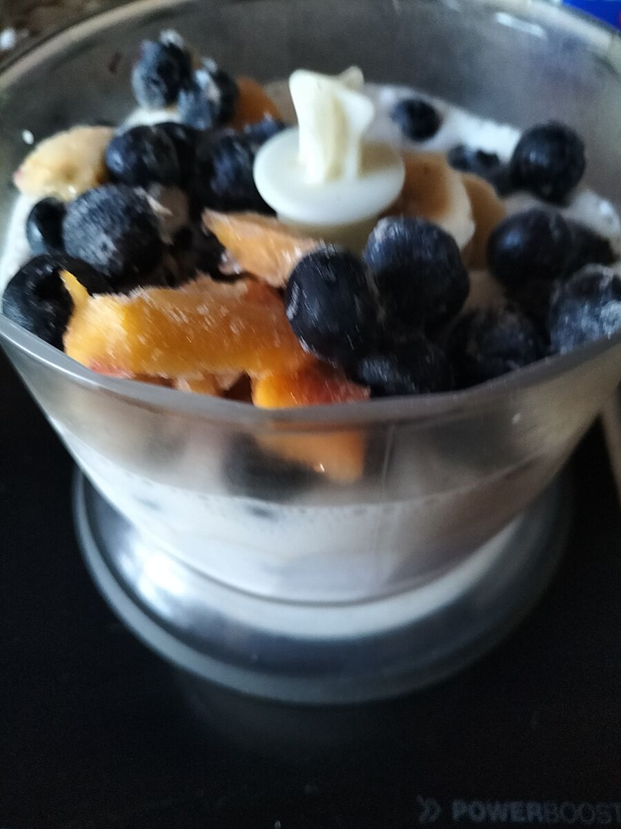 На 100 мл вершків йде 1 банан, м´якоть 1 персика без шкірки і лохина десь 200-300 грам. Як на мене, зараз це просто ідеальне поєднання смаку. Якщо хтось любе трохи солодше, то цукор потрібно додати (2-3 ч.л) у вершки до фруктів, збити до розчинення, а вже потім додати заморожені фрукти.