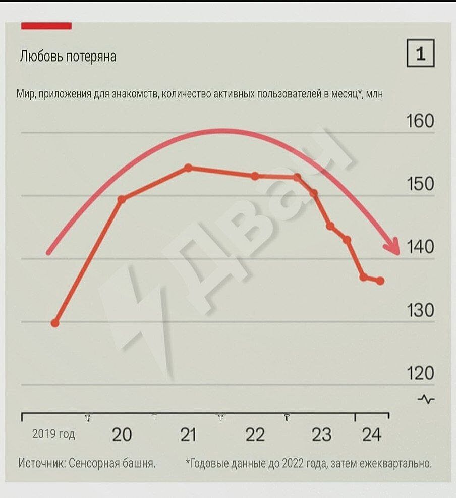 По данным исследования, мировое число ежемесячно активных пользователей в дейтинг-приложениях упало с 2021 года со 154 млн до 137 млн человек.