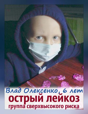 История нашего героя: Влад родился и рос абсолютно здоровым активным и не по годам взрослым малышом. Когда ему было 3 года, из семьи ушел папа. Мама осталась одна растить и воспитывать малыша. Всё было неплохо, но в июне 2013 года, как гром среди ясного неба, прозвучал диагноз врачей - Острый Т- линейный лимфобластный лейкоз, группа сверхвысокого риска. Это редкий вид рака крови. В нашей стране трое деток с таким диагнозом и наши врачи против него бессильны. Владу срочно нужна пересадка костного мозга от неродственного донора, которую ему могут сделать только за границей. Фонд Русфонд оплачивает саму операцию и частично реабилитацию. К сожалению точных цифр нет, т.к. всё будет зависеть от состояния Влада и мы должны быть готовы ко всему. СБОР в сумме 500000 руб. (127500 грн.) на реабилитацию, проезд, проживание на время пребывания в Санкт-Петербурге. Сейчас Влад находится в больнице города Полтавы в ожидании донора для ТКМ. После ее проведения его ждёт курс реабилитации, от которой зависит дальнейшее состояние здоровья нашего бойца. Семья малыша исчерпала все свои финансовые возможности за пол года, что Влад с мамой находятся в больнице. Вся надежда только на помощь добрых людей. Не проходите мимо беды. Помогите Владу одержать верх в этой нелёгкой борьбе за ЖИЗНЬ!