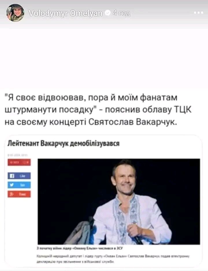 Вакарчук сам ухилянт, зробив собі посвідчення, що він воював пів року і його списали. Але поранень не видно, бо добре скаче по сцені. Він ще й допомогу від держави отримав в розмірі 600 тис грн. А для простих вояк роблять такі перешкоди, щоб вони не змогли отримати компенсацію за поранення, тому багато лишається і без зроров´я, і без грошей.