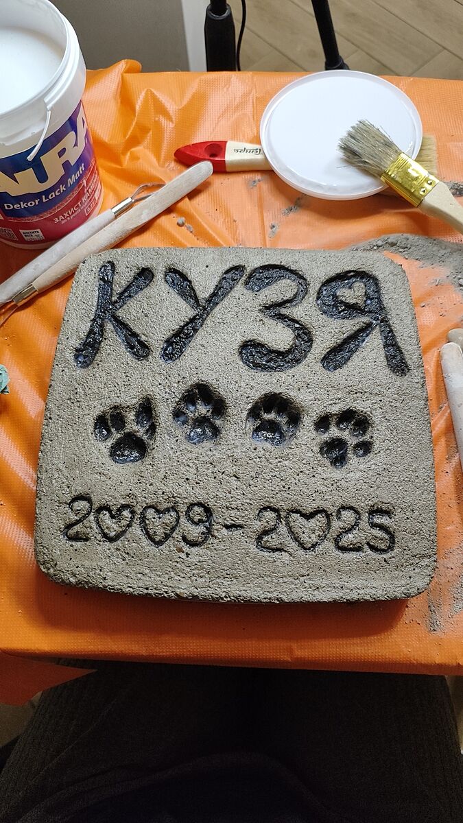 Мій кіт самий любимий і офігенний на жаль помер на днях (діабет, ниркова недостатність і старість) - я вже остатньо наревілась і готова показати яку пам´ятну плиту йому зробила (то справжні відбитки лапок, ми вилили копію лапок ще при житті звичайно) - то ж може комусь буде як ідея