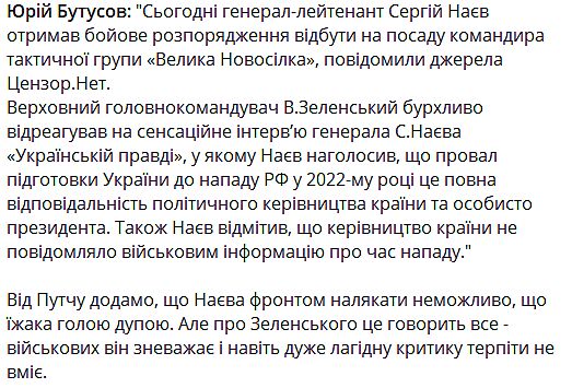 І ось одразу після інтервʼю, у якому Наєв розповів про провал підготовки до війни та відповідальність Зеленського, Верховний головнокомандувач миттєво дав Наєву нове призначення. Очевидно, щоб він якомога швидше залишив Київ і не міг на фронті давати нові інтервʼю іншим засобам масової інформації.