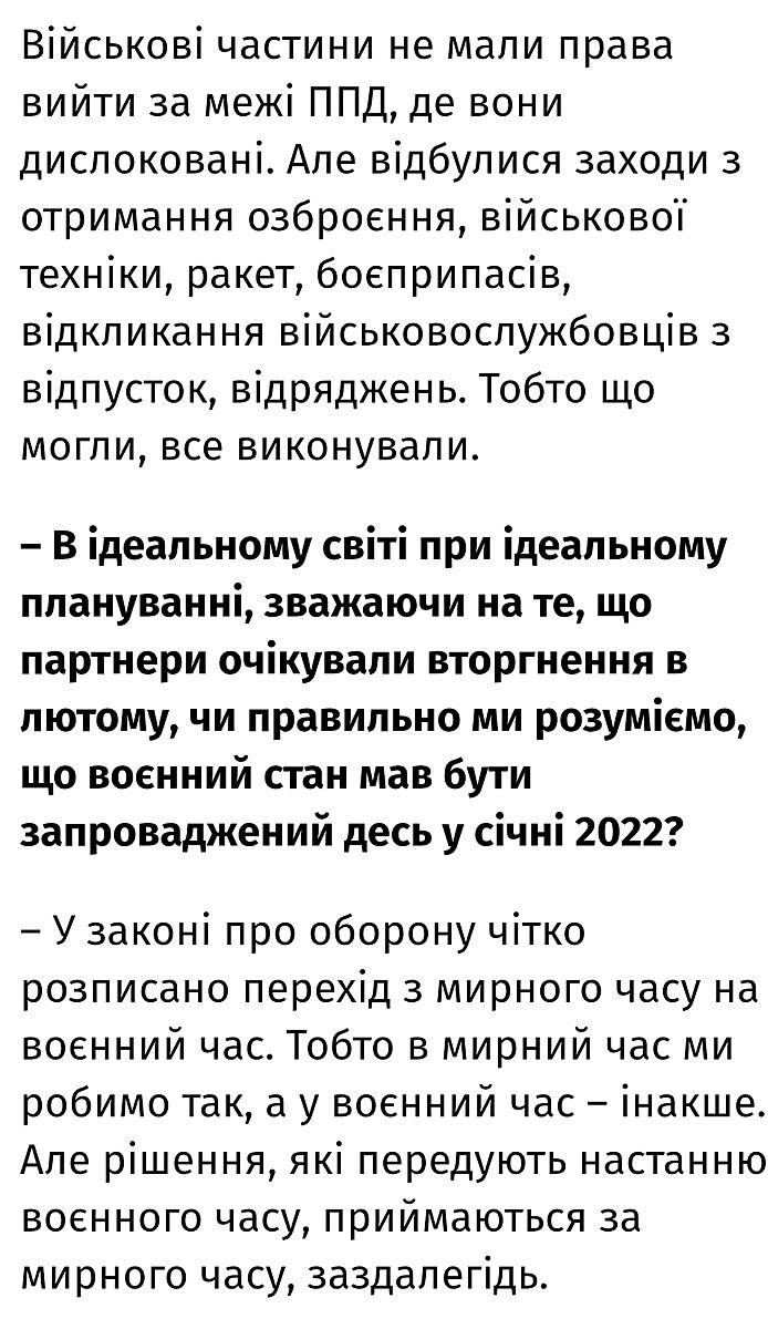 ну він же дав розпорядження вранці 24 лютого. а поки нема військового стану і наказу Президента про застосування ЗСУ то головком взагалі нічого не мав права робити. він на свій ризик почав висувати окремі підрозділи