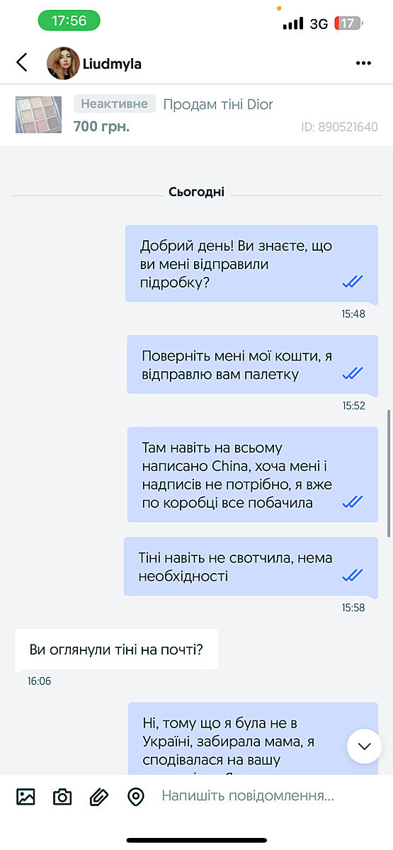 Добрий день! Можливо застережу когось від покупки у  Грохольської Людмили Валеріївни з м. Тернопіль(або області). Ця недобросовісна жіночка продала мені б/у фейк тіней Том Форд. Сподіваюся мої 1300 гривень підуть Людмилі Валеріївні на користь… Скріни переписки і фото мадам додаю. Ну і звичайно я в блоці кругом)