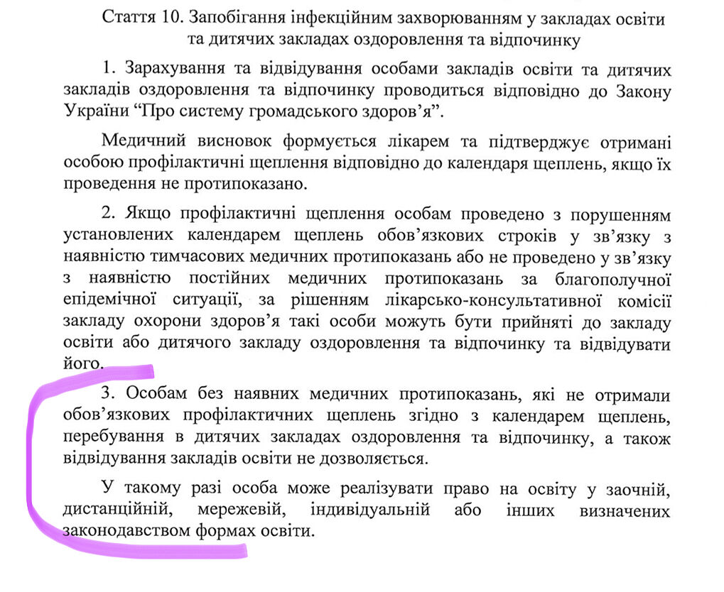 Той законопрект забороняв нещепленим дітям відвідувати заклади освіти очно. Антиконституційний законопроект так і не став законом. Вітаю всіх українців, які ходять в садочки і школи без щеплень, а також їх батьків. Продовжуємо навчатись і самостійно розпоряджатись своїми тілами.