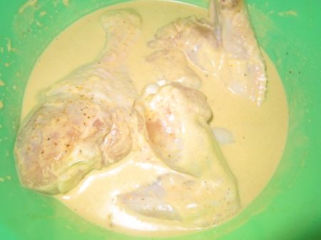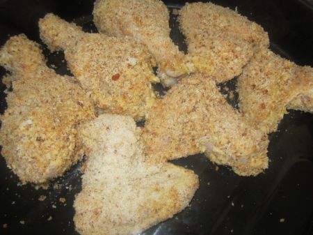 Я покупала крылышки и голени. Помыла их и сложила в миску, сверху наляпала майонезом,горчицей,пиво налила где то стакан на 4,5 кг курятины, посолила,поперчила еще травки-муравки для курицы добавила,поставила на пол часа-час настаиваться. Насыпала в тарелку сухарей панировочных(можете сами натереть если какой то сухарик дома залежался,только не булочку,она сладкая и не очень вкусно будет) потом обкатала все крылышки и сложила на противень,лучше конечно же его накрыть еще бумагой для выпечки но у меня не было ее в наличии.