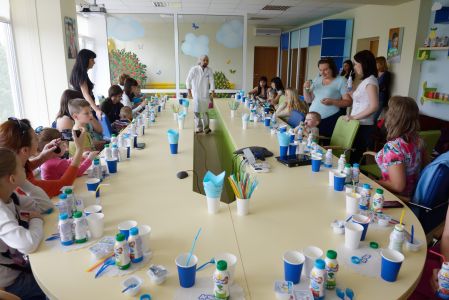 После экскурсии мы переехали в административное здание компании Вимм-Билль-Данн Украина, где мы кушали продукцию завода «Агуша». Хочу сказать, что мы часто покупаем «Агушу» и моя дочка ест её с удовольствием, то мы скушали все что нам дали. Причем её было интересно кушать с цветных ложечек и пить кефир из трубочки. Когда малыши покушали их ждали аниматоры и развлечения. В специально отведенном уголке были принц с принцессой. Пока детки играли, мамы слушали экскурсовода и задавали ему свои вопросы. А в конце нам вручили подарки (футболку для мамы и пазлы для дочки), после чего повезли обедать в ресторан. Приятно удивило отношение и организация поездки. Моя дочка три дня всем рассказывала, что видела принцессу. Спасибо большое «Агуше».