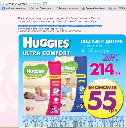 Акция действует в магазинах proStor с 30 сентября по 13 октября на подгузники Huggies Ultra Comfort 66 шт. и 80 шт. в упаковке.