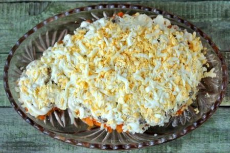 Далее следует слой из яиц (крупная тёрка), майонез. Поставьте салат на 1 час в холодильник, чтобы он настоялся и слои пропитались.