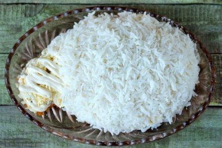 Отварите до мягкости морковь, а также яйца вкрутую и рассыпчатый рис до готовности (в солёной воде). Остудите отваренные продукты. Очистите морковь и яйца. Это слоёный салат, поэтому все ингредиенты выкладывайте слоями, каждый из которых промазывайте или поливайте тонкой струйкой майонеза. Морковь (крупная тёрка) выложите на блюдо в форме тела овечки, а именно сформируйте овал с выпуклостью, и промажьте майонезом.