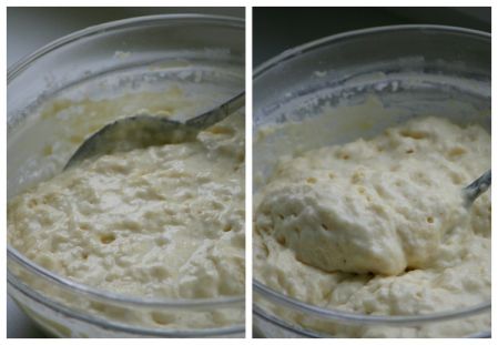 Теперь главная фишка: жидкое выливаем в сухое и перемешиваем, но не до гладкости, а до такого целлюлитно-комковатого состояния, главное, чтоб мука разошлась. Отставляем на 15 минут. Тесто за это время слегка вздуется. Оно должно быть вот такой консистенции (слева сразу после размешивания, справа спустя 15 минут).