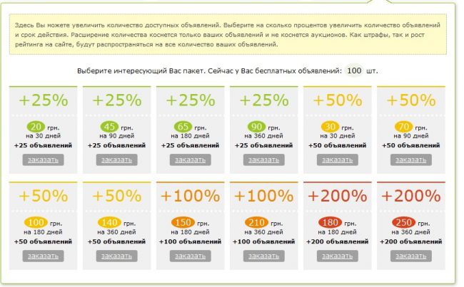 Так же, по вашим многочисленным просьбам, мы реализовали возможность увеличения количества доступных объявлений (не относится к аукционам). На текущий момент количество доступных объявлений напрямую зависит от вашего рейтинга и на будущее эта привязка остается, но уже сейчас вы можете докупить процентное увеличение количества объявлений. (Например: вам доступно 50 объявлений, докупив пакет 100% увеличения, вам станет доступно 100 объявлений. При увеличении Вашего рейтинга, количество доступных объявлений вырастает до 80, а с учетом пакета процентного увеличения это составит 160 объявлений)