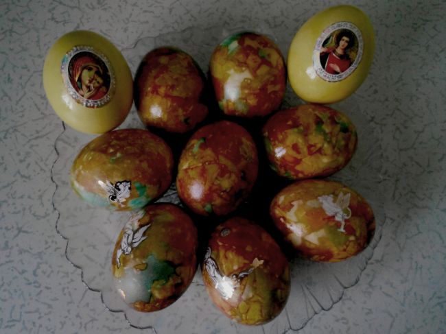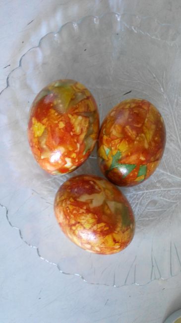 Как оказалось проще простого...шелуха и зеленка..нашла рецепт вк,но решила что это напряг...он попросил показать как и сам сел и сделал..жёлтые варил в куркуме...