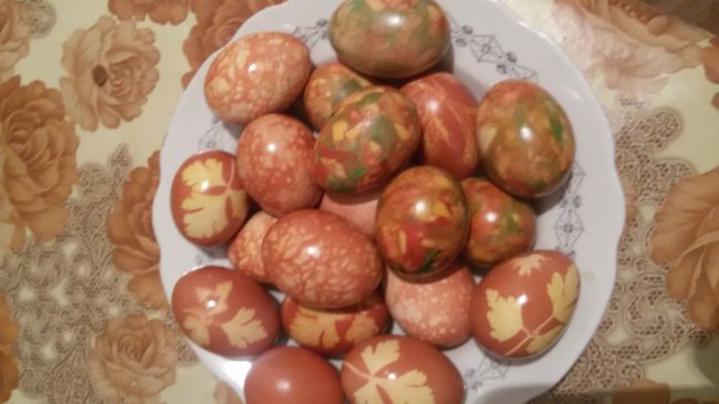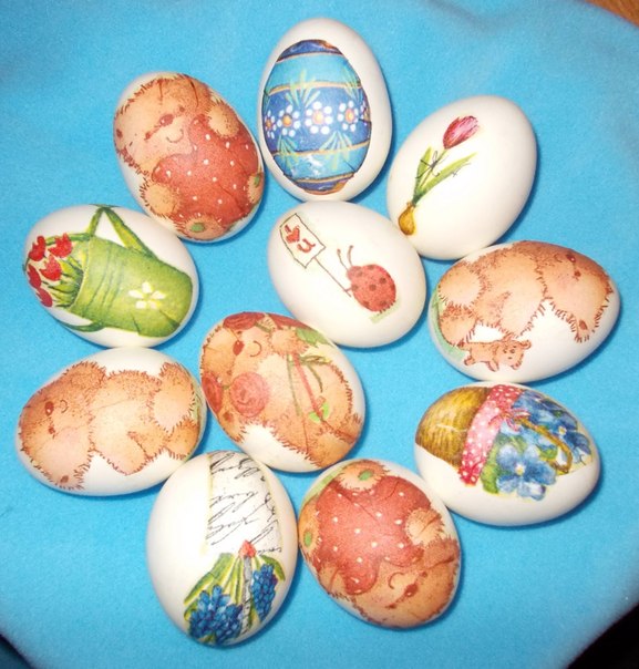 я сколько себя помню, мы с мамой делали такие мраморные и с листочками в шелухе)) а я вот года три назад не успевала ничего, в 10 вечера вспомнила что яйки ещё красить, шелухи не нашла, наклеек в доме никогда и не было... так спаслась декупажем))) муж смеялся долго... говорил что я могу задекупажить весь мир, если мне дать добро))