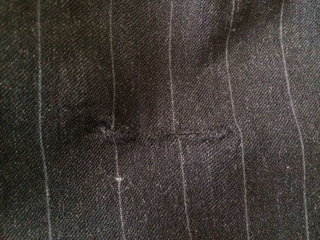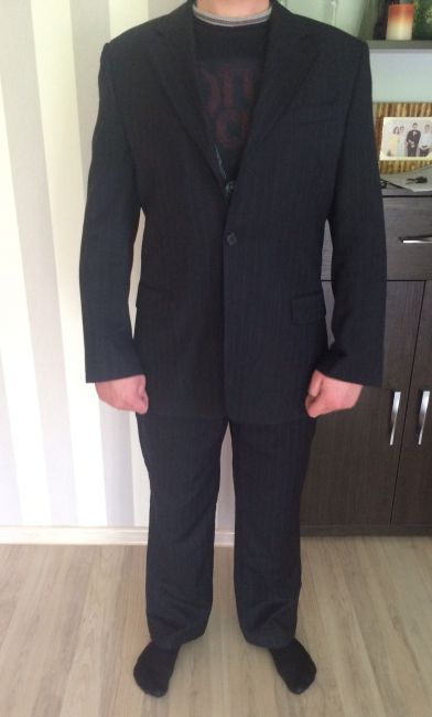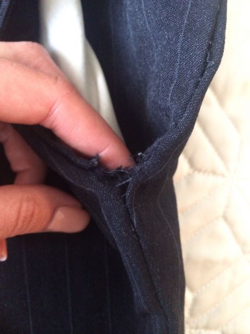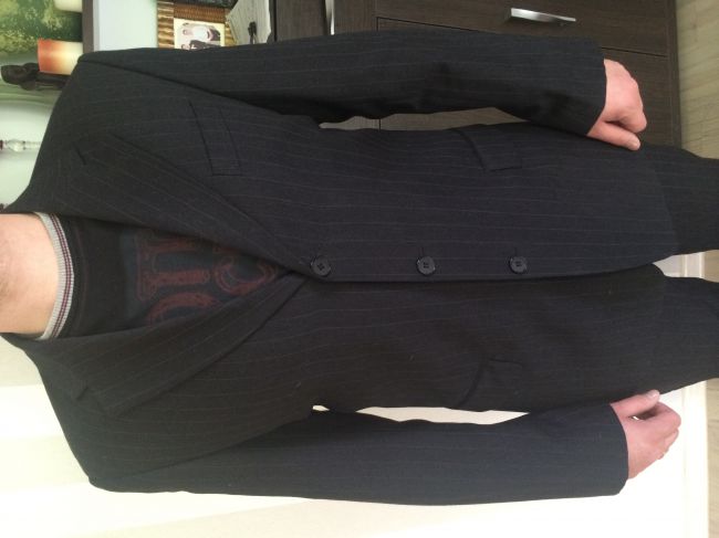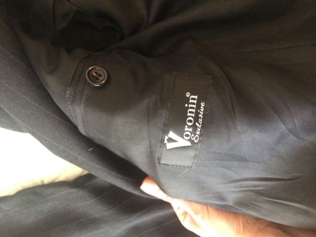 Отдам мужской классический черный костюм в полоску от Михаила Воронина.Шили на заказ поэтому размера нет. У мужа рост 173 см., на вес до 70 кг (муж сейчас 78 кг,он ему мал). Есть дефекты,на брюках на молнии вырван бегунок,немного разошелся один карман и на брюках была сигаретой пропалена дырка,ее отремонтировали - см фото, когда пиджак надет и застёгнут этого дефекта не видно. Одет максимум 5 раз в жизни. Отправка нп за ваш счет.