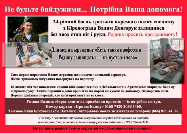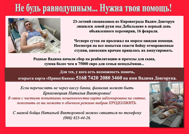 23-летний спецназовец из Кировограда Вадим Довгорук лишился левой руки под Дебальцево в первый день объявленного перемирия, 16 февраля. Четверо суток он пролежал на морозе ожидая помощи. Несмотря на все попытки спасти бойцу отмороженные ступни, киевским врачам пришлось их ампутировать.