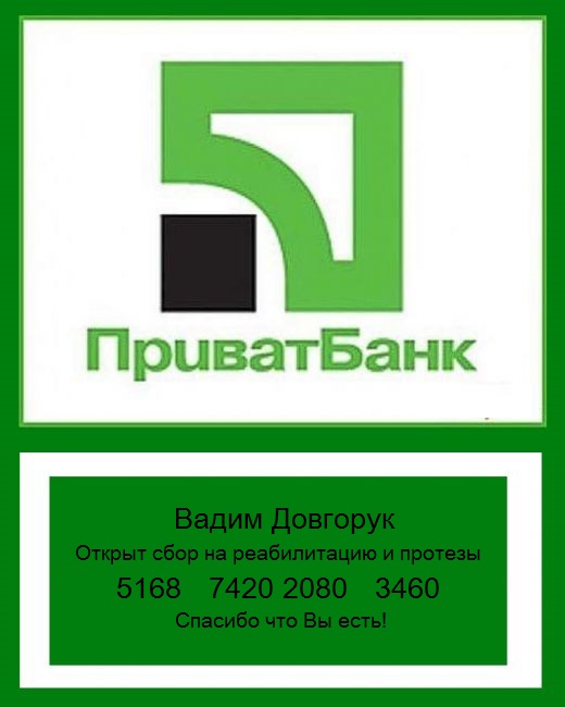 Для тех, у кого есть возможность помочь, открыта карта «ПриватБанка» 5168 7420 2080 3460 на имя Вадима Довгорука. Если перечислять не через кассу банка, фамилия может быть Брюховецкая Наталья Викторовна! В связи с частыми попытками мошенничества карта заблокирована на снятие, пополнить ее вы можете в обычном режиме выбрав ПРОДОЛЖИТЬ