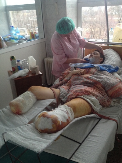 «Время от времени приходил в себя и слышал выстрелы» — Не могу пока даже прогнозировать, когда мы сможем перевести Вадима в отделение, — говорит заведующая гнойно-септической реанимацией столичного Центра термических травм и пластической хирургии киевской клинической больницы №2 Наталья Исаенко. — У Вадима пострадали не только стопы, но и голени, есть отмершие участки кожи. Но мы бьемся за каждый сантиметр пострадавших тканей. Вадиму предстоит долгое лечение и восстановление. К сожалению, некроз глубоко поразил ступни. Лечение, которое мы проводили, не дало эффекта. Мне самой больно говорить о том, что этому молодому бойцу, оставшемуся без руки, мы ампутировали еще и обе ступни. — Я был ранен в первый день вновь объявленного перемирия, 16 февраля, — рассказывает Вадим. — Наш БТР вел колонну по дороге из Дебальцево в Артемовск. При выезде из города в нас выстрелили, скорее всего, из ручного гранатомета. Один из снарядов залетел внутрь, где я находился с другими бойцами. Мне сразу оторвало руку. Бронированная машина проехала еще немного и остановилась. Ребята выбрались наружу, я тоже вывалился на дорогу. Внутри нельзя было оставаться — это верная смерть. Не помню, что творилось вокруг, но я понимал: нужно добежать до придорожной посадки. Это у меня получилось. Упал в кустах, где и пролежал четыре дня.