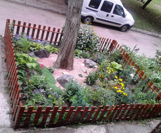 У нас на Оболони женщина воле дома целый садик высадила) Такая красота! Сейчас и детей и бабок гоняют сами жильцы - не дай бог кто руки потянет) Сама лично школьников гоняла, чтобы цветы не рвали. А особо отличившийся дедушка вылил с балкона какие-то помои ночью на тех кто пытался молодую яблоньку выкопать)))