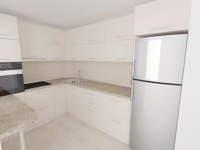 Мне нравится первый вариант расположения и полностью белый цвет. Кухня получается очень воздушная, просторная и светлая.
