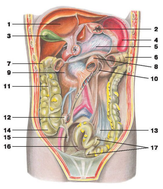 1 — печень; 2 — желудок; 3 — желчный пузырь; 4 — селезенка; 5 — поджелудочная железа;