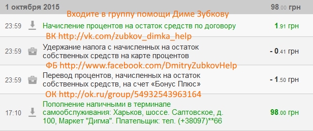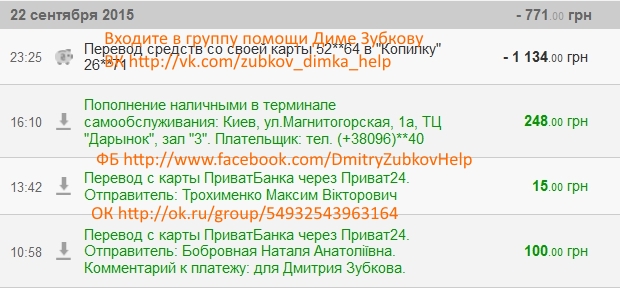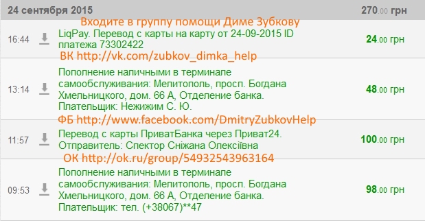Реквизиты для перечисления средств с любого банка Украины: Установа банку ПриватБанк МФО банку 305299 КОД ОКПО отримувача 14360570 КОД ОКПО банку 14360570 Рахунок отримувача 29244825509100 Для поповнення карти 5211537323890264, Зубков Александр Владимирович, 2731010114