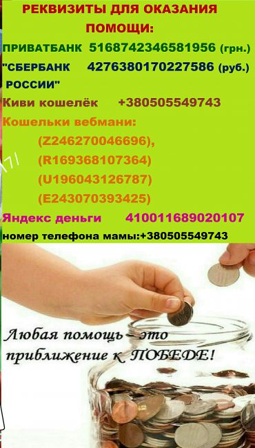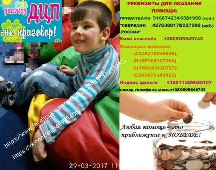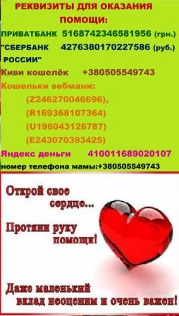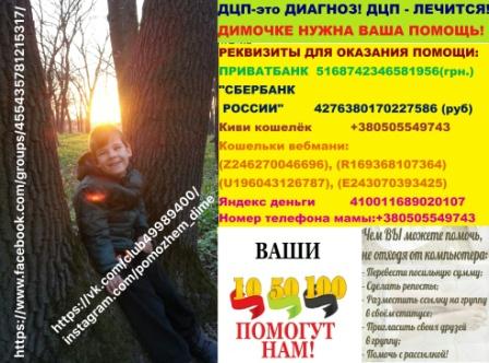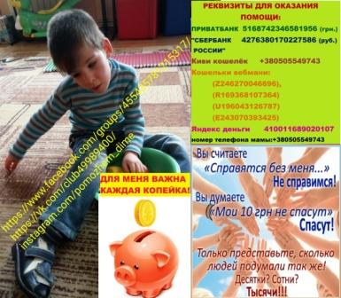 Дорогие друзья, информацию о Диме разместили на ТСН ’Допомога’. Мы собрали необходимую сумму. Низкий поклон всем, кто нам помогал, поддерживал. Но помощь и поддержка нам нужна всегда, т.к. дорога к полноценной жизни очень долгая! Я верю, что у Димы всё получится!