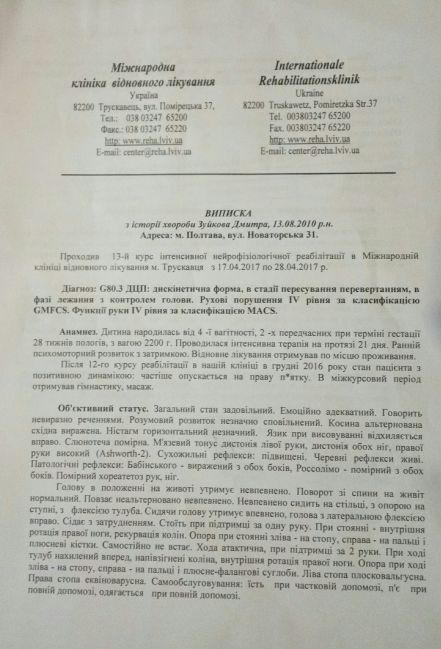 Я, Лата Елена Леонидовна из г.Донецк (сейчас, как переселенцы, живем в г. Полтаве), обращаюсь к добрым людям, которые не равнодушны и не черствы душой. Если в ваших силах помочь моему крошке, мы примем любую помощь, идущую от сердца на лечение моего сына Зуйкова Дмитрия 13.08.2010 г.р. Димочка развивается… старается….мы ему помогаем.. К сожалению, наш мальчик самостоятельно не сидит и не ходит, но все понимает, на все реагирует, ползает на спине… Ему нужна постоянная реабилитации (массажи, ЛФК, лекарства), чтобы поставить на ноги. Я ВЕРЮ, что он будет ходить… Все упирается в деньги. Многие центры нам предлагают своё лечение! Из того лечения (реабилитации),что нам предложено на Украине мы стараемся по мере возможностей проходить! Прошли четыре курса в Международной клинике восстановительного лечения им. Козявкина в г. Трускавец, проходили регулярную реабилитацию в реабилитационном центре «С надеждой на будущее», были в Одесском санатории «Хаджибей», прошли курс реабилитации в Полтавском центре реабилитации, лечимся медикаментозно. Конечно в развитии ребёнка достигли мы немного, но для нас и это радость, потому что Диме предрекали быть "растением". У Димулечки есть положительная динамика: Дима научился держать голову (ещё неуверенно, но все-таки), ползает на спине, стремится ходить, играет игрушками, к сожалению, правая ручка работает плохо, пытается говорить, знает буквы, старается считать до 10, любит когда ему читают книги, очень любит, чтобы с ним играли дети! Наш мальчик - очень ласковый и нежный, улыбчивый ребёнок. Никогда не скрывает своей радости при встрече родных ему людей. Я знаю — время упускать нельзя, у Димы есть шанс научиться самообслуживанию, и, возможно, даже встать на ножки!! Глядя в глаза своему крошечке, полные надежды и веры, я не могу бездействовать.