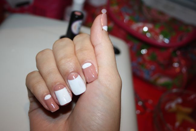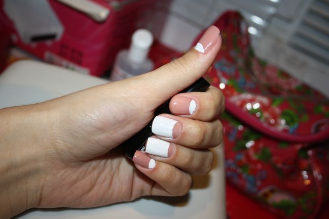 Как мастер вам напишу: если присмотреться, то видно кривые и неровные лунки. Я бы вам посоветовала перекрыть белый поверх топа бежевым основным цветом. Так как белый уж очень бросается в глаза, забивая основной тон. Такой маникюр красиво на картинке смотрится. А в реале будет выглядеть, как буд-то у вас только два ногтя накрашены. Ну или на крайний случай, если любите блестки, притушуйте немного белый.