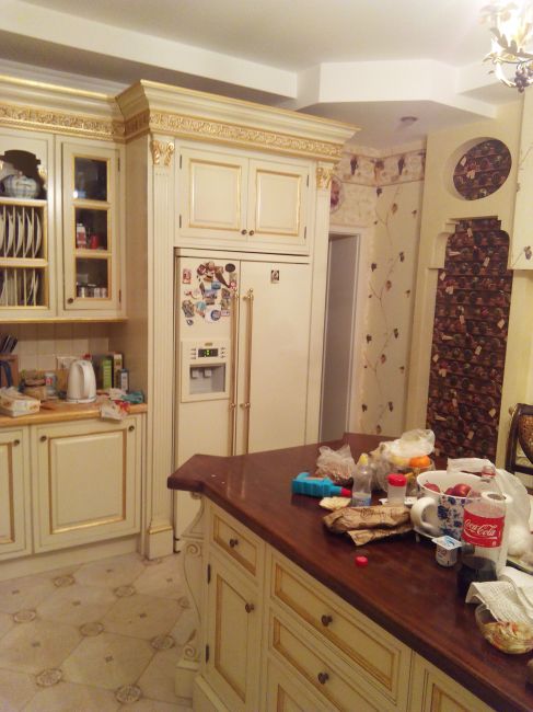 Кухня автора красивая,но я бы выбрала ту где золотой декор использован дозировано.Большинству такая кухня недоступна в любом виде.