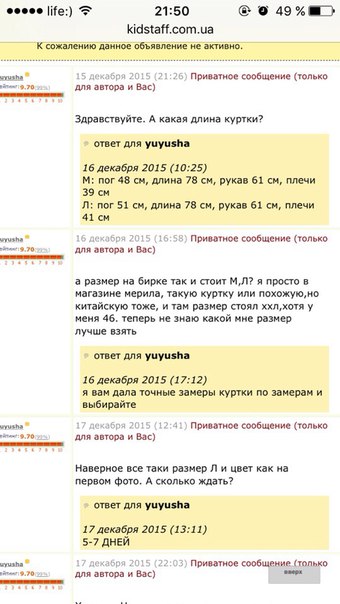 Прошу помощи, не знаю как мне поступить. 18 декабря оплатила 870 грн за куртку у продавца Супретти https://www.kidstaff.com.ua/user-720942.html , уточнив перед этим сроки ожидания, мне был дан ответ что ждать 5-7 дней, на 12 день я написала сколько еще ожидать заказ, но продавец мне не ответила, хотя на сайт заходила, на следующий день я написала снова и ответа опять не было, а потом она и вовсе перестала заходить на сайт. Сначала я подумала Новый Год, потом может что-то у человека случилось. Номер телефона я сразу у нее не взяла, написала девушкам, которые у нее покупали и одна мне написала ее номер,звоню третий день -трубку не берут.Сегодня все-таки решила оставить отзыв, после этого написала мне девушка,которая так же почти месяц ждет свой заказ и сумма у нее тоже приличная. Самое печальное что деньги мы переводили на мужское имя и с какого она города тоже не знаем. Скрины прилагаю
