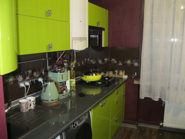 Покажите или опишите. Хочу такую яркую, т.к. маленькое помещение и темное. Какого цвета столешница, фартук, пол, обои? Думаю, салатовый с серым сочетается? С черным точно не хочу - марко и на большие помещения. Посоветуйте, пожалуйста)