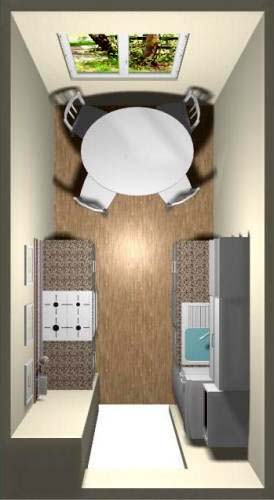 Стена узкая. Выше написали - сделать потайной шкаф с полками (по правой стене), в него поставить холодильник и морозильник. У меня у свекрови и золовки холодильники стоят в коридорах возле кухни, красота, правда там коридоры широкие.