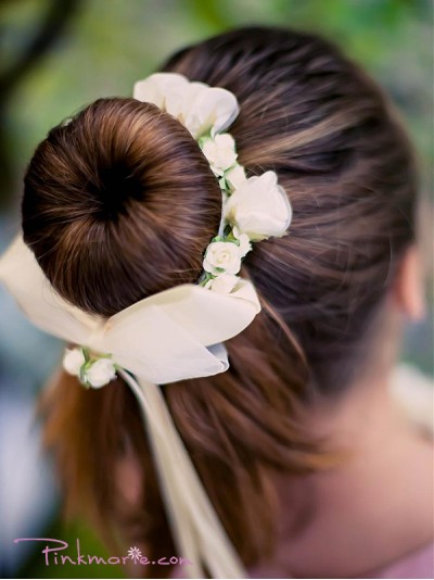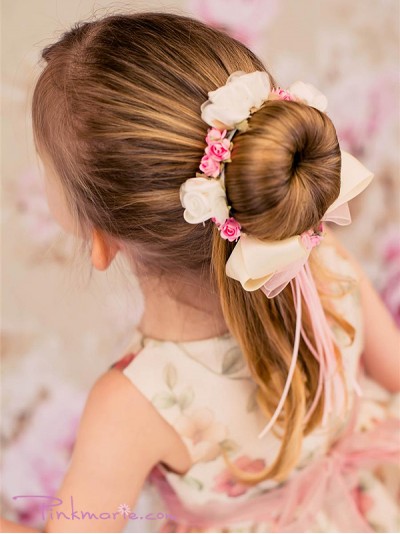 Завязываете высокий хвост, одеваете толстую резинку для бабетты(в любых точках с резинками продается или можно из махрового носка сделать для пробы), распределяете хвост по кругу, одеваете поверх резинку под цвет волос и все. Затем украшаете любым декором.