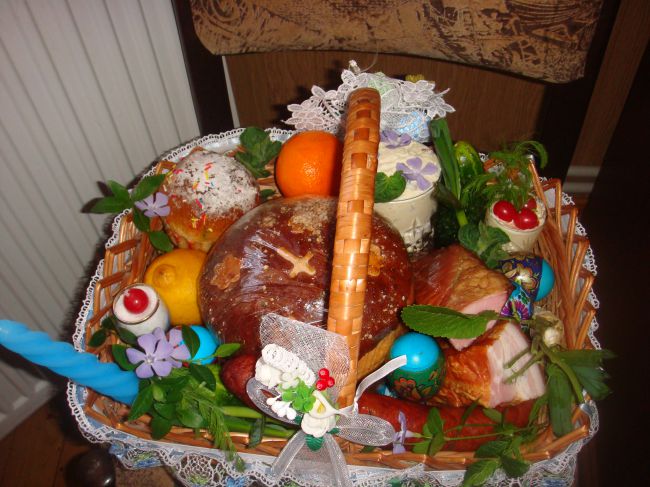 Обязательно свечка,кулич,сырная пасочка в красивом хрустальном или из цветного стекла стаканчике.Разноцветные яйца,круг колбаски по периметру.