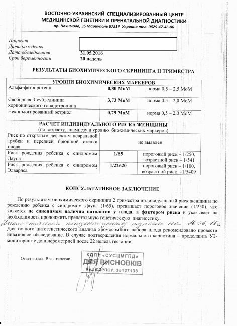 я не решаю такой вопрос тут, мне утром позвонили из генетического центра, сообщили результаты. Дообследование и консультацию генетика назначили на 14.06 - вторник. В моём городе такие услуги не оказываются, маленький город.