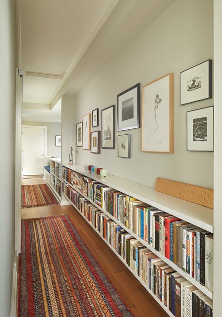 Зачем вообще что-то делать? Вы сколько времени в том коридоре проводите? Ну прошлись туда-сюда и всё. Полки навесьте красивые (только не много) и всё.