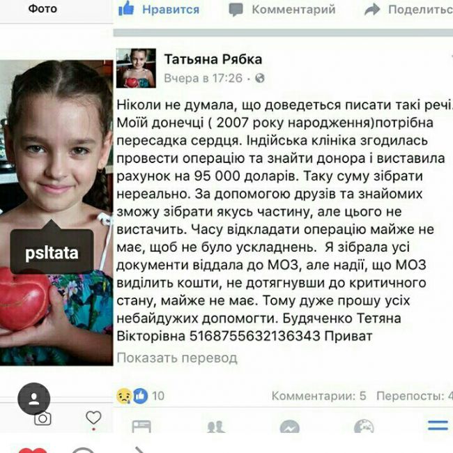 Вынуждена писать о помощи . Близкий для меня человек оказался в страшной ситуации-ее доченьке нужна СРОЧНАЯ пересадка сердца! Прошу Вас как мама-ПОМОГИТЕ, в силу Ваших возможностей.