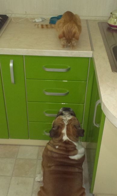 К тому же у нас собака:увы,кошка шипит и бъет его лапой.