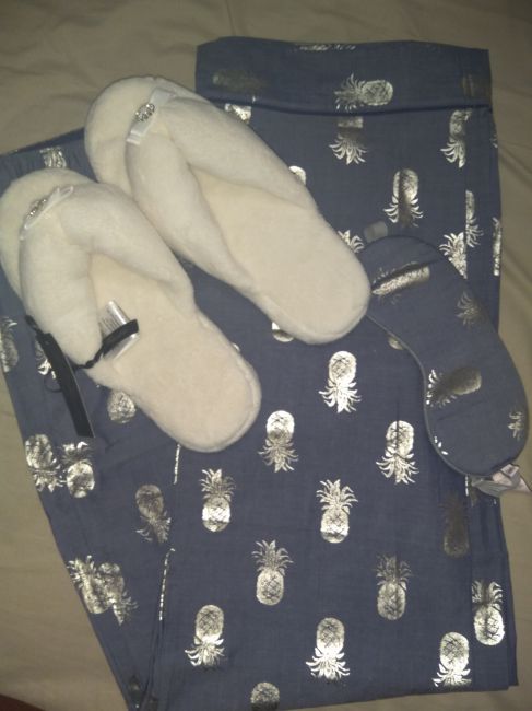 Пижама, честно не помню, распрадажа, или 30, или 40 баксов, она скользкая и не цепляется за постель ( наз. The Mayfair Pajama) тапки - лав репаблик, брала без скидки за 400грн кажись, сейчас там распрадажа и скидки
