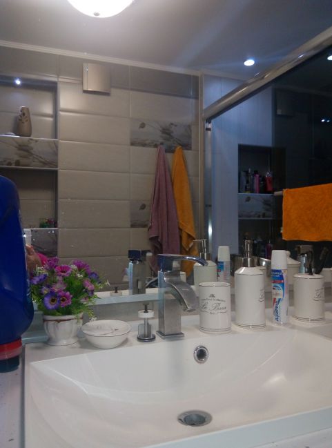 А в ванной у меня на всю стену зеркало. От и до. От столешки до светильников и до душевых штор. Плохо видно, но серый кафель это отражение в зеркале