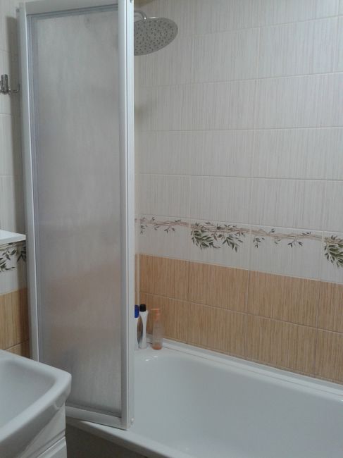 Огромный плюс в том, что она не прилипает к телу при купании, вода прекрасно стекает в ванну, только нужно обязательно правильно ее установить. Мне мальчики ремонтники сначала поставили на см выше, и естественно вся вода текла на пол, попросила их переделать и теперь красота. Взяла шторки с эффектом капель, поэтому не сильно видны загрязнения. Единственный минус-резинка сильно плотно ходит по самой ванной и иногда из за этого выпадает и надо ее обратно воевать, а это дело не простое)))