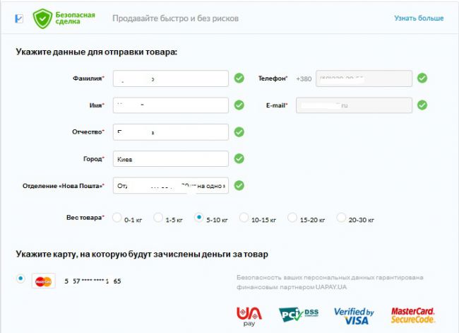 ну это не для тех кто трясется над своей социальной кредиткой с детскими))) Насчет того как указать вес отправления, так тут очень просто, скрин приложу. Как только покупатель оплачивает товар, на почту приходит письмо где вы должны подтвердить вашу сделку, после подтверждения в смс приходит номер ТТН, вы долюны этот номер сказать оператору новой почты, и все, ждите денежки на карту