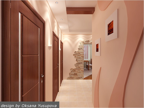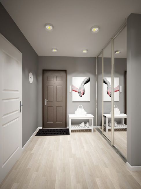 Холодный светло- серый пол будет прекрасно сочетаться с теплыми стенами песочного цвета, все бежевые и охряные оттенки, корица, мокко и все подобное, начиная от самых светлых тонов и заканчивая темными, на стены можно будет повесить картины или фото в рамках серебристого или серого цвета, потолок белый, это выигрышное, классическое сочетание. Бирюза в коридоре будет навязчива, так как мало деталей чтоб грамотно расставить акценты и поддержать этот цвет.