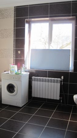 У нас в ванной окно, мы наклеили матовую пленку, с узором, смотрится красиво, на улицу ничего не видно, ухаживать легко.