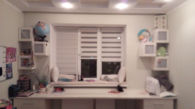 Окно комнаты если выходит на северную сторону, т как на последнем фото действительно будет темновато. Вы подумайте нужны ли Вашей дочке столько полок или 4х достаточно?!